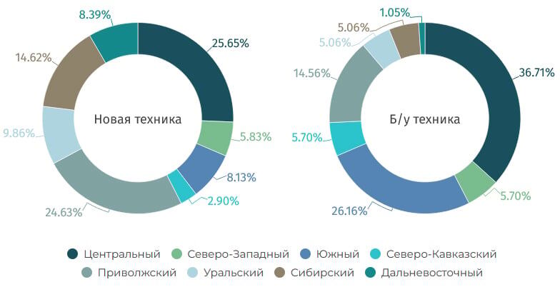 Наименьшая активность поставщиков наблюдалась в Северо-Кавказском (менее 3% объявлений о продаже новой техники) и Дальневосточном регионах (доля в б/у сегменте — чуть более 1%).