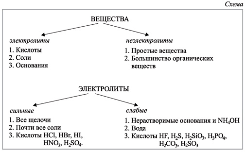 Электролиты — вещества, водные растворы которых или расплавы проводят электрический ток. Неэлектролиты — вещества, водные растворы которых не проводят электрический ток. К электролитам относятся соли, кислоты, основания. Большинство органических веществ электролитами не являются. Так, не относятся к электролитам углеводороды, спирты, альдегиды, углеводы и др. Электропроводность электролитов обусловлена присутствием в их растворах (или расплавах) ионов, которые и обеспечивают прохождение электрического тока. Для объяснения электропроводности водных растворов кислот, солей и оснований С. Аррениус выдвинул в 1887 г. теорию электролитической диссоциации. В соответствии с этой теорией, электролиты при растворении в воде распадаются (диссоциируют) на ионы — положительно и отрицательно заряженные. Положительно заряженные ионы называются катионами, отрицательно заряженные — анионами. На самом деле в водных растворах катионы металлов и анионы кислотных остатков существуют в гидратированном вид