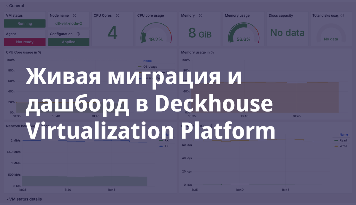 Мы давно не делились новостями разработки Deckhouse Virtualization Platform (DVP) — нашей платформы, которая позволяет виртуальным машинам и контейнерам работать в одном окружении. Недавно мы доработали живую миграцию виртуальных машин между гипервизорами: теперь она выполняется без прерывания сетевых соединений. А ещё пользователям стал доступен дашборд в Grafana, который позволяет следить за потреблением CPU, памяти и других параметров. Живая миграция виртуальных машин — это механизм, который позволяет переносить запущенную ВМ с одного гипервизора на другой без прерывания её работы. Это важно, например, когда физические узлы кластера необходимо перевести в режим обслуживания или перезагрузить. Deckhouse Virtualization Platform основана на Kubernetes, изначально заточенном под stateless-контейнеры, которые можно без проблем перезапускать на узлах кластера без потери данных. Виртуальные машины же работают с дисками и имеют более строгие требования к задержкам при миграции, которым необ
