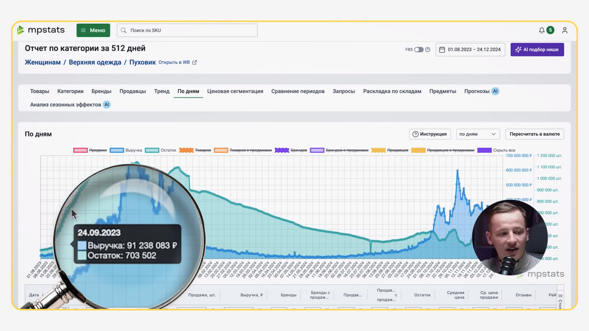 Сначала немного про нишу. Я в одежде, потому что здесь хаос. Селлеры не понимают, как работает сезонность, как прогнозировать спрос, что делать с возвратами. Например, ниша пуховиков: в 2022 году все на ней заработали, в 2023-м многие остались с неликвидом, и в 2024-м туда никто не зашёл.