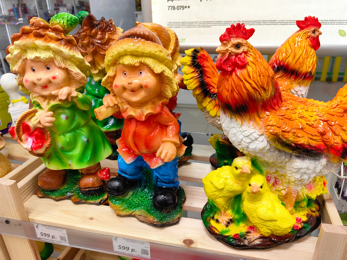 Ничего себе, столько классных новинок появилось в Галамарт, весенняя коллекция для сада и дома! Что привезли? Собственно, шла мимо, совсем в другой магазин, а через стекло увидела большие фигурки. Настолько по-летнему яркие, что зашла посмотреть. И вам покажу! Вот они, только выставили. Крупная курочка, практически в натуральный размер и цыплята рядом. Выглядят как настоящие. Проработаны четко, от мелких до крупных деталей. Нет смазанности. Не сразу заметила, подставка с объемными цветами, курочка с цыплятами на лужайке. По идее, поставить среди травы на газоне и будет реалистично выглядеть. По высоте садовая фигурка не менее 30 см. Из гипса. Чем нравится Галамарт, так это тем, что ценники моментально появляются, вместе с новинкой. Всегда чисто, все красиво и по отделам расставлено. Это так, мысли вслух. Вернемся к новинкам. Почти такие же по высоте фигурки девочки и мальчика. У девочки в корзинке крупная спелая клубника. Мальчик держит в руке садовый инструмент. Похожи на сказочны