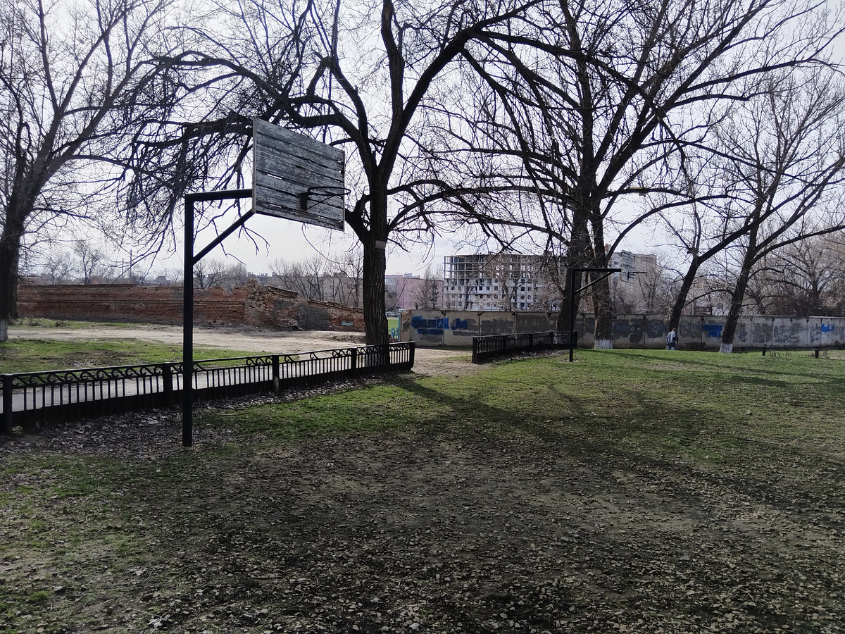 Спортивная баскетбольная открытая площадка на территории спорткомплекса. Площадка недостроенная, засыпана щебнем, деревянные щиты сгнили. Требуется застелить покрытие, заменить щиты, нанести разметку, повесить сетку, нужно ограждение. Фото/видео: Для проекта Т гранты.