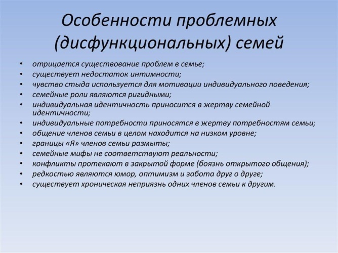 Дисфункциональная семья - это та семья, в которой постоянно происходят конфликты, глубокое отрицание существующей проблемы и отсутствие ее решения. Семья не может нормально функционировать из-за наличие проблемы, а ее отрицание приводит к полному разладу семьи и хроническим страданиям всех ее членов.