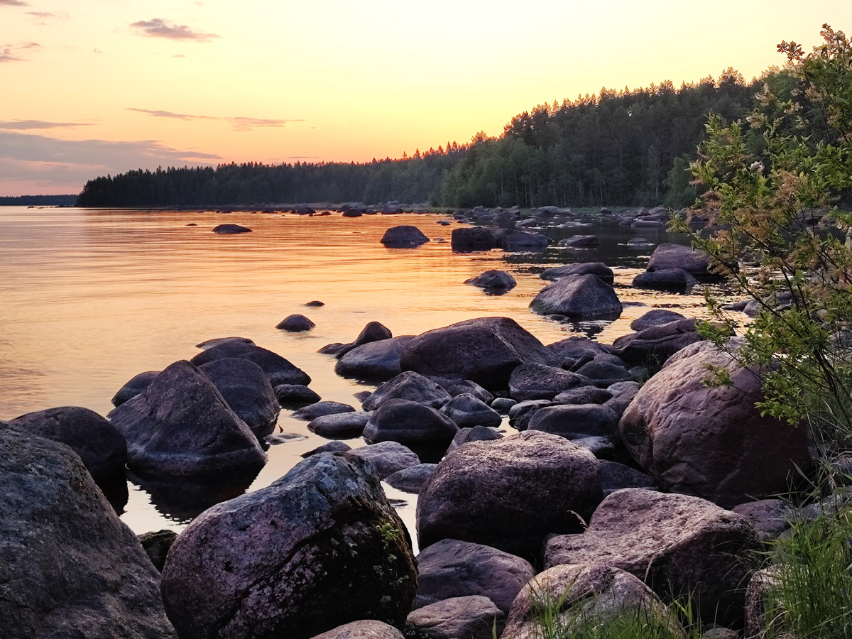 За Видлицей берег Ладоги становится каменистым. Ехали по трассе и решили выйти и поснимать его. Виды воды и камней на закате выглядели очень красиво и умиротворяюще — настоящая северная красота. Остановились в деревне Погранкондуши. Она находится на холме, оттуда открываются виды на карельские лесные просторы и Ладожское озеро. На окраине деревни нашли камень с обозначением старой советско-финской границы. Приятно вот так случайно находить свидетельства прошлого, которые просто лежат у дороги.