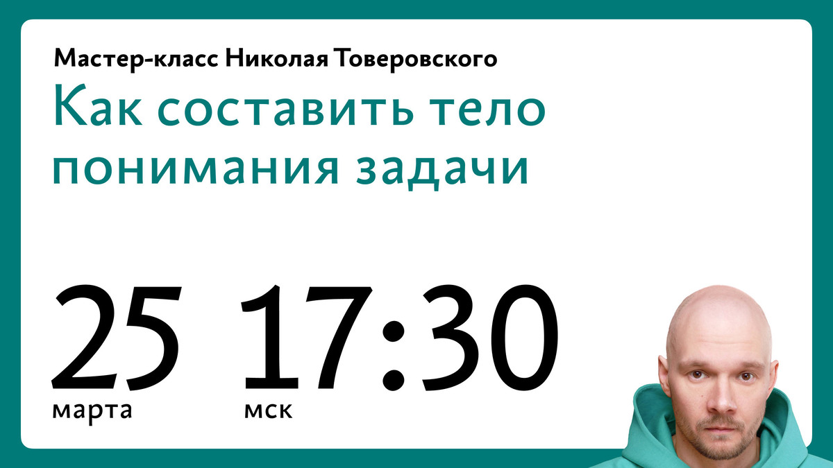 Через час начнётся бесплатный мастер‑класс Николая Товеровского о составлении тела понимания задачи. Николай расскажет, как написать основную часть понимания проекта, чтобы глубже разобраться в сути проекта, предусмотреть риски и повысить его шансы на успех. На мастер‑классе он разберёт примеры понимания задач студентов Школы бюро и участников мастер‑класса, ответит на вопросы. Трансляция в Телеграме