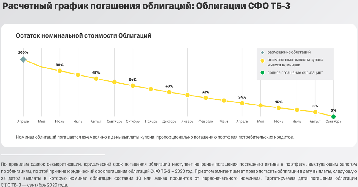 🤚 Здравствуйте, товарищи инвесторы и граждане спекулянты. Пачка свежих новостей пожаловала в студию - спешу озвучить! ---------- 🆕 НОВЫЕ РАЗМЕЩЕНИЯ / АНОНСЫ: 🌷 СФО ТБ-3 (без рейтинга) проводит до 26 марта сбор заявок на свой дебютный выпуск. Если чуть расшифровать, бумаги представляются как "Т-Кредитный поток". Те же самые бумаги, внутри которых потребительские кредиты, на этот раз от Т-Банка. Как и любое СФО, обладает специфическими условиями: купон 25% ежемесячно (но первая выплата лишь 26 июня), объем - 4,5 миллиарда рублей, а дальше сложности начинаются. Выпуск сопровождает амортизация на усмотрение эмитента, и по плану уже в сентябре 2026 года бумага полностью погасится. Также имеется CALL, который компания может использовать при достижении 10% от первоначального номинала. Фактически за относительно высокой купонной ставкой спрятан быстрый возврат денег (20% номинала погасятся уже в июне этого года) и придется снова думать, куда их положить. Для наглядности график плановых