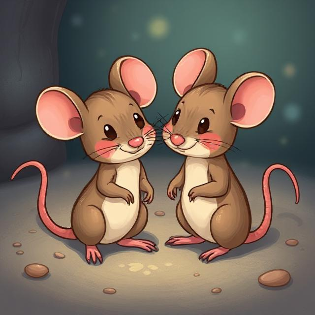 Жили-были два маленьких мышонка, Шмыг и Шмяк. Они были лучшими друзьями и жили в уютной норке под старым дубом. Однажды, когда солнце спряталось за горизонтом, а мама-мышка уснула, Шмыг и Шмяк решили отправиться на прогулку. Они мечтали увидеть ночную лесную жизнь и узнать, какие тайны скрываются в темноте. Мышата тихо выбрались из норы и отправились в путешествие. Сначала всё шло хорошо: они прыгали по траве, ловили светлячков и играли в прятки. Но вскоре лес стал казаться им незнакомым, и они поняли, что заблудились. Ночь становилась всё темнее, и страх охватывал их маленькие сердечки. — Что же нам делать, Шмяк? — спросил Шмыг. — Мы ведь не знаем дороги домой! — Давай попробуем найти кого-нибудь, кто поможет нам, — предложил Шмяк. Так они шли дальше, пока не увидели величественного оленя, стоящего у реки. Олень был огромный, с большими ветвистыми рогами, и выглядел очень внушительно. — Ой, какой большой! — прошептал Шмык. — Может, он нас съест? — Нет, давай попросим его о помощи, —