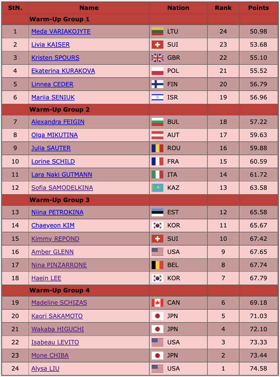 Список прошедших в произвольную участниц, их баллы первого дня и порядок выхода на лёд: