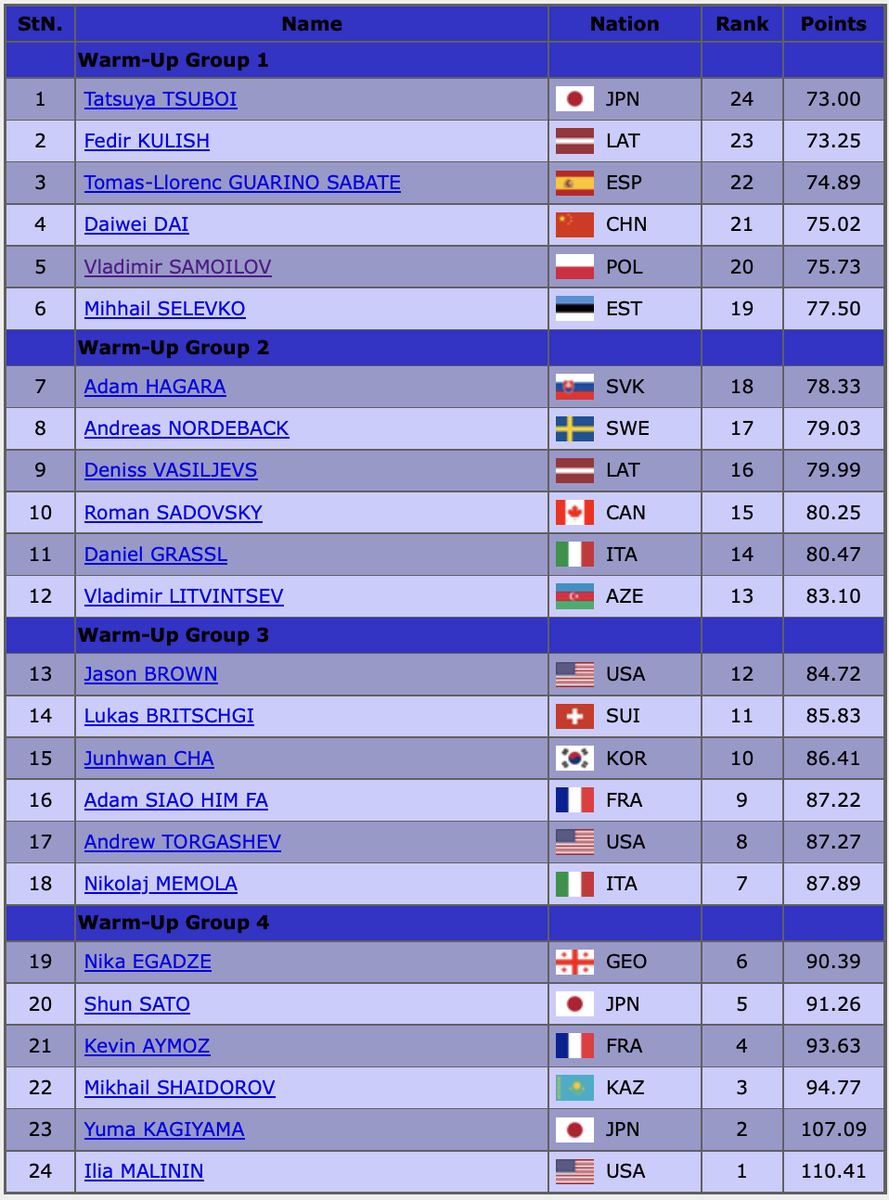 Кратко расскажу о некоторых выступивших в первой половине турнира. У Владимира Самойлова прокат получился достаточно грязным. Денис Васильевс с 4S - больше квадов не делал, прокат чистый. У Динаэля Грассля бабочка на лутце (двойной вместо четверного), 4Lo чисто, плохое приземление на 4S с недокрутом. У Владимира Литвинцева 4Т+3Т чисто, сольный 4Т чисто, падение с 3А, во второй половине небольшая ошибка на тройном лутце.