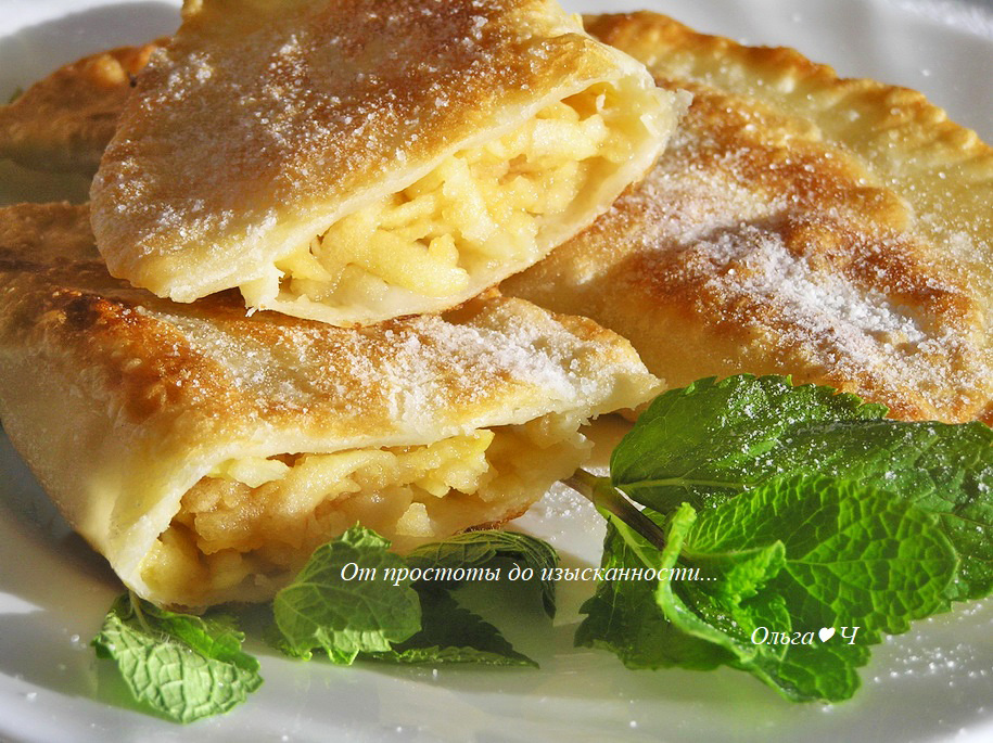 сахарная пудра для посыпки Приготовление: Приготовьте тесто. Муку насыпьте в миску, сделайте углубление. Влейте масло, теплую воду и всыпьте соль. Замесите эластичное тесто. Скатайте тесто в шар, накройте и оставьте на 30 минут. Затем тесто разделите на 12 частей. Для начинки яблоки натрите на терке. Каждую часть теста раскатайте в круг, выложите начинку. На этом этапе можно посыпать ванильным сахаром или корицей. Защипните края, формируя чебурек, затем сделайте "узор" вилкой, тем самым дополнительно скрепляя края. Прижмите ладонью чебурек для равномерного распределения начинки внутри. Сделайте остальные чебуреки. Обжарьте чебуреки на растительном масле с двух сторон. Затем выложите на бумажное полотенце. Подавайте, посыпав сахарной пудрой. Приятного аппетита! Вам т