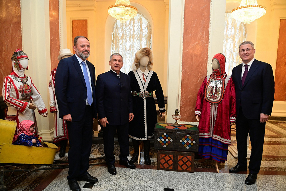 Перед началом совещания Игорь Комаров и Радий Хабиров вместе с Раисом Татарстана Рустамом Миннихановым посетили выставку «Традиционный костюм народов Поволжья».