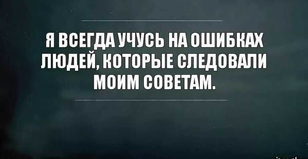 Всегда ли мы задумываемся ,для чего мы бежим впереди ветра со своими советами?Почувствовать себя умнее?Показать свое внимание и участие?Как правило,большинство людей делает это из каких -то добрых,с их точки зрения,побуждений.Зачем?Разве вы можете залезть в шкурку именно этого человека,в его мозг и вляпаться в 100% его обстоятельств?Ваши советы нужны только вам самим для поднятия своей значимости.