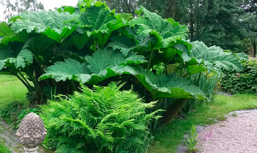 Гуннера (Gunnera) — впечатляющее растение с гигантскими листьями и удивительной способностью разрастаться до густых зарослей.