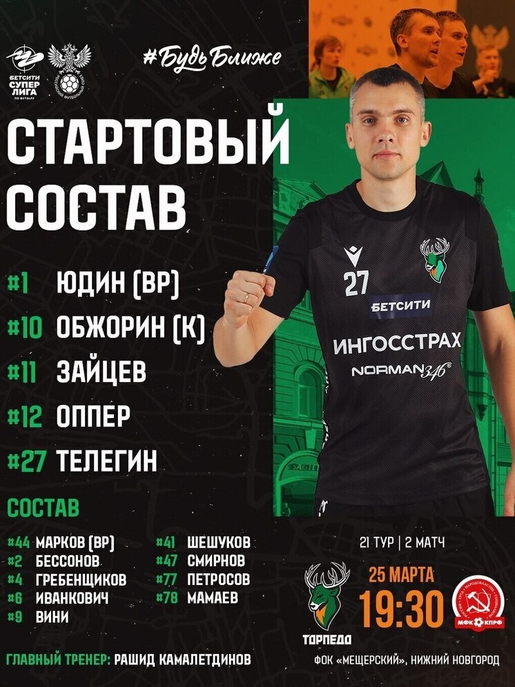 В 21-м туре Чемпионата России по футзалу нижегородское «Торпедо» примет столичный КПРФ на паркете ФОКа «Мещерский». Начало матча в 19:30. Вчерашнее противостояние между командами завершилось победой москвичей с минимальным преимуществом - 4:3. КПРФ занимает третье место в турнирной таблице Суперлиги, имея 83 очка. Подопечные Рашида Камалетдинова - на восьмой строчке, в их копилке 59 баллов. Прямую трансляцию матча смотрите на телеканалах ННТВ и СпортHD.