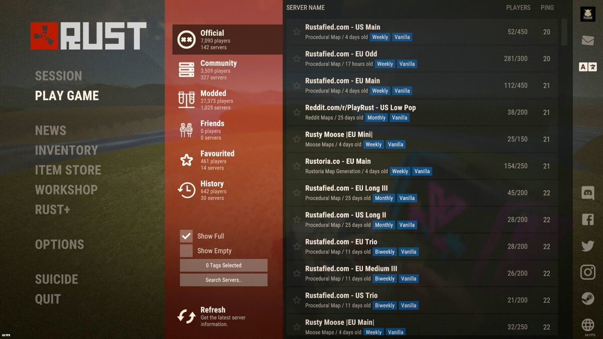 Для удобства разделю статью на 4 части: 1)Выбор сервера! 2)Начало,фарм и тд. 3)Где строить дом? 4)А что дальше? !ВЫБОР СЕРВЕРА! Сервера делятся на Official,Community,Modded. Также поделим на предназначение! Сервера с меткой Build чтобы построить удобную для тебя базу и проверить её на прочность Сервера с меткой PvE для новичков, на них по игрокам не проходит урон от воздействия других игроков Vanilla сервера без безделушек по типу тп на базу с нажатием бинда или получением "Китов" Modded напротив есть киты, тп, внутресерверные магазины и разные ивенты! Solo,Duo,Trio,Unlimited обозначают сколько чел. мб. в команде, также могут обозначаться так MAX 2 и тд. Рейты, это значение с которыми ты получаешь руду дерево или предметы с ящиков и бочек! Пример: X2,X3,X5,X100 и тд. Ладно с серверами разобрались приступим со стартом!