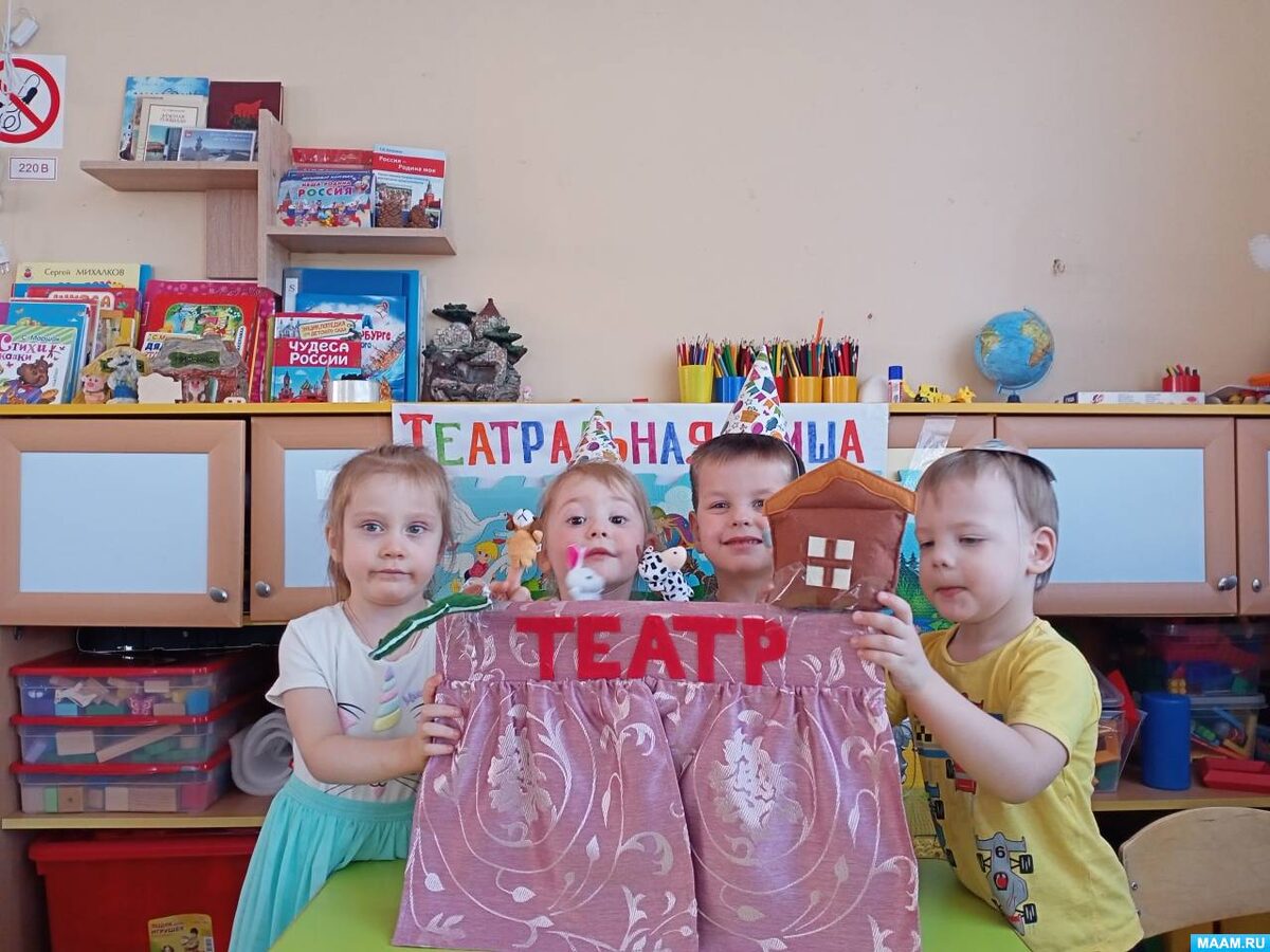 Цель: знакомство детей с театром, вызвать желание принимать участие в театрализованной деятельности. Задачи: 1. Познакомить детей с разными видами театра: пальчиковый, кукольный, настольный, Би-Ба-Бо. 2. Учить детей правильно пользоваться атрибутами. 3. Развивать выразительную речь, внимание, память. 4. Развивать умение драматизировать знакомые сказки с помощью воспитателя. Любимый наш театр Со сценою-малышкой, Он сказку открывает И дружит с детской книжкой. Веселые артисты — Совсем невелики, И в возрасте артисты От трёх и до пяти. 27 марта отмечается Всемирный День Театра. Театр для детей – это волшебный мир, в котором ребенок проявляет свои эмоции, в игре познаётся всё прекрасное. Малыши любят настольный театр, игры-драматизации. Каждый хочет участвовать в инсценировках, примерять разные атрибуты. Начинаем мы беседу о театре, о том, когда появился кукольный театр. Дети узнали, как нужно вести себя в театре: сидеть спокойно, не кричать, не ходить по залу. В начале мы сделали театральн