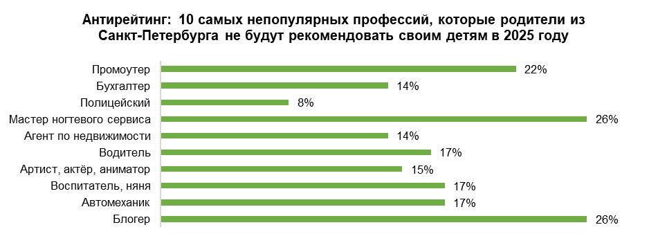 Среди профессий, которые петербуржцы стремятся отговорить своих детей выбрать, оказались блогеры, промоутеры и водители. Эти специальности воспринимаются как менее надежные и стабильные. В целом предпочтения родителей отражают текущие тенденции на рынке труда, где высокотехнологичные отрасли и медицина занимают ключевые позиции, сообщили в пресс-службе hh.ru.