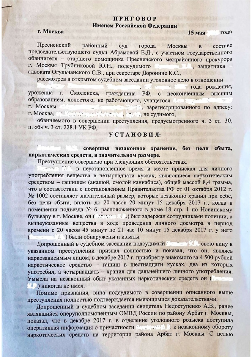 Обстоятельства дела: Обратились, как-то, ко мне родители молодого парня, которого несколько дней назад задержали сотрудники полиции с наркотиками. Ранее не судимый, студент, с обеспеченными и порядочными родителями и вдруг – сбытчик наркотиков. Ему было предъявлено обвинение в совершении преступления, предусмотренного ч. 3 ст. 30 , п. «б» ч. 3 ст. 228.1 УК РФ. На первом свидании в СИЗО мой новый подзащитный поведал мне, что действительно приобрел наркотик, но исключительно для личного употребления, т.к. на протяжении длительного времени курит «гашишь» и не может избавиться от этой пагубной привычки.