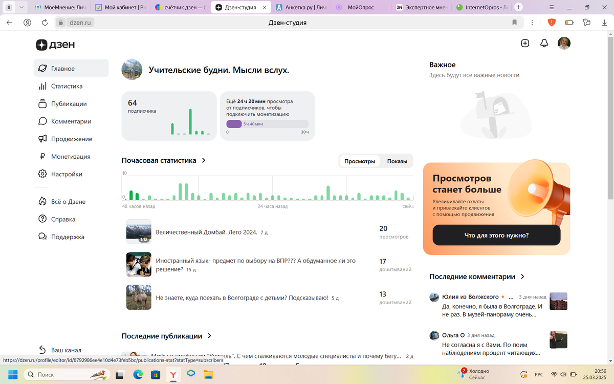 Эх, приучили нас, учителей постоянно писать отчёты))) И хоть на Дзене их никто не требует, но страсть к отчётам никуда не спрячешь)) Поэтому, напишу-ка я сегодня отчёт о двух месяцах на Дзене. О печалях и радостях, проблемах и переживаниях, с которыми пришлось столкнуться в это время. Вчера стукнуло ровно 2 месяца, как я открыла ноутбук и завела канал на Дзене. Обычно я очень долго обдумываю свои решения, а вот тут прям толкнул меня кто-то. Ну, раз завела канал, садись тогда и пиши) Села, начала писать) Написала первый пост и сижу жду)) Сейчас же на меня показы посыпятся и подписчики толпами начнут прибавляться))))) Ага)) Держи карман шире))) Итак, с какой же целью я завела этот блог? Не скрою, были надежды на дополнительный доход. Потом, почитав статьи многих авторов, поняла, что рассчитывать на дополнительный доход на Дзене не стоит. Значит, будем искать другие, менее меркантильные цели))) Первый месяц сильно переживала, постоянно мониторила статистику. Психовала, обижалась на Дзен