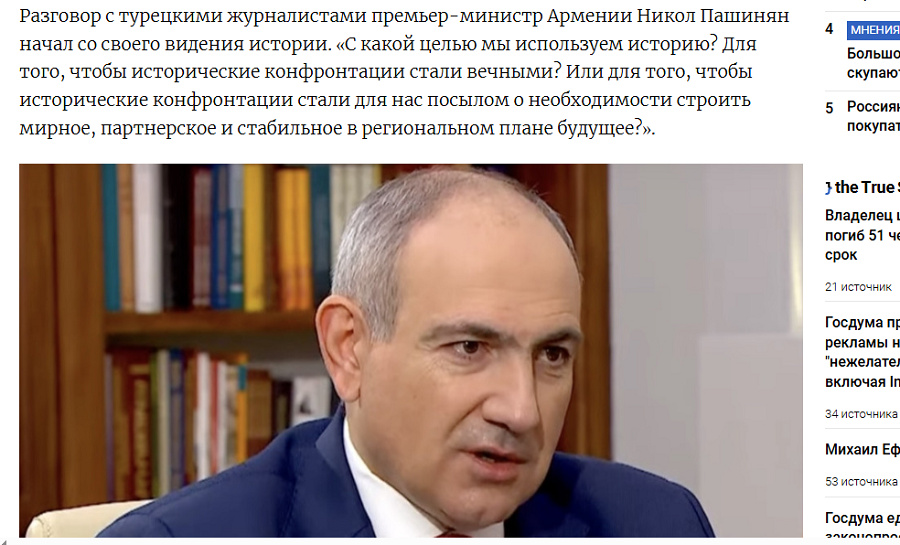 The Moscow Times. Разговор с турецкими журналистами премьер-министр Армении Никол Пашинян начал со своего видения истории. «С какой целью мы используем историю? Для того, чтобы исторические конфронтации стали вечными? Или для того, чтобы исторические конфронтации стали для нас посылом о необходимости строить мирное, партнерское и стабильное в региональном плане будущее?».