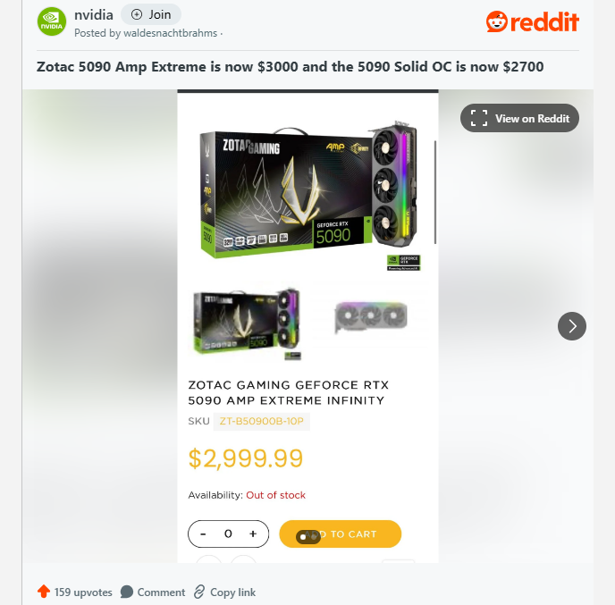 Компании ASUS, MSI, а теперь и ZOTAC имеют одну общую черту. Эти партнеры NVIDIA по производству видеокарт предлагают прямые продажи геймерам через свои официальные магазины в США. Их также объединяет кажущееся отсутствие интереса к продаже своих карт по официальной рекомендованной розничной цене, установленной NVIDIA. Каждая компания теперь повышает цены на свои модели после запуска. Хотя причины повышения цен могут быть разными, включая отсутствие поставок, увеличение производственных затрат, изменения курсов обмена валют США или импортные пошлины для клиентов, истина в том, что большинство этих факторов ожидались. Самая дешевая карта RTX 5090 в настоящее время стоит 2700 долларов, что на 700 долларов больше, чем было объявлено NVIDIA в январе. К сожалению, купить эти карты по рекомендованной розничной цене просто невозможно. Фактически, пользователи сообщают, что компания вообще удалила подобные карты из своего магазина. ZOTAC представила эксклюзивный способ покупки видеокарт для пр