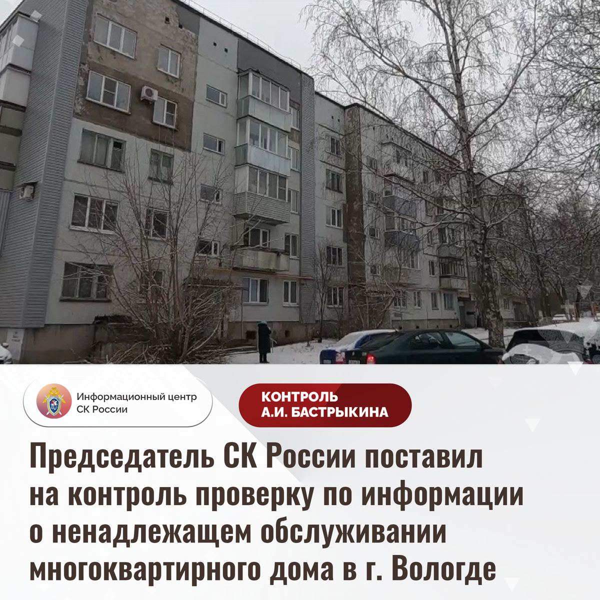 Председатель СК России поставил на контроль проверку по информации о ненадлежащем обслуживании многоквартирного дома в г. Вологде