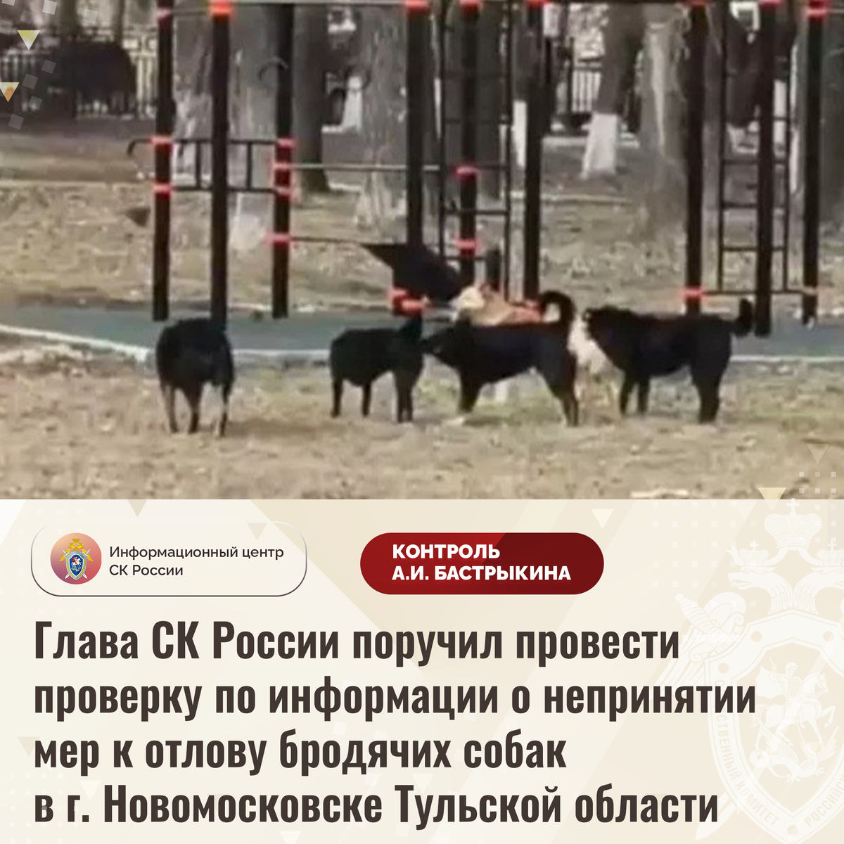 Глава СК России поручил провести проверку по информации о непринятии мер к отлову бродячих собак в г. Новомосковске Тульской области В СМИ сообщается, что в городе Новомосковске Тульской области вблизи образовательного учреждения длительное время обитает стая бродячих собак, проявляющих агрессию к прохожим. Мер к отлову животных не принимается, в связи с чем граждане опасаются за безопасность своих детей. Председатель Следственного комитета Российской Федерации Александр Иванович Бастрыкин поручил руководителю СУ СК России по Тульской области Владимиру Владимировичу Усову провести процессуальную проверку и представить доклад об установленных в ходе первоначальных проверочных мероприятий обстоятельствах, а по завершении проверки – о ее результатах. Исполнение поручения, а также ход процессуальной проверки поставлены на контроль в центральном аппарате ведомства. #СледственныйКомитет #СКРоссии #СК #ИЦСКР #ИнформационныйЦентр #АлександрБастрыкин #ПредседательСКР #КонтрольПредседателяСКР #