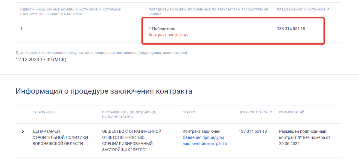 На данный вид работ министр Кулешов уже безуспешно потратил почти 77,5 млн рублей. Деньги – бюджета Воронежской области. Таким образом, стоимость реконструкции БУЗ «Эртильская центральная районная больница» теперь может составить почти 190 млн рублей. Хотя изначально, в июне 2022 года, сумма контракта была 133,3 млн рублей. Тогда контракт был подписан между департаментом строительной политики Воронежской области (нынешним Министерством) во главе с Артуром Кулешовым и единственным участником торгов ООО «Специализированный застройщик «Легос». скриншот сайта госзакупок Эта организация, зарегистрированная в Новоусманском районе, заявляет о себе как о «надежном застройщике». фото сайта ООО "СЗ "Легос", на фото - руководство компании, которое не справилось с реконструкцией "Эртильской ЦРБ" и не хочет возвращать в облбюджет полученный аванс в под 50 млн рублей Однако при исполнении контракта с Минстроем по реконструкции БУЗ «Эртильская центральная районная больница» эти строители не справилис