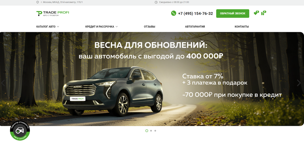 В автоцентре Трейд Профи продаются автомобили с пробегом. В каталоге представлено более 20 марок. Информация о наличии авто не обновляется. Нет верифицированных отчетов о состоянии авто. Нет гарантии, что авто, представленные в каталоге, соответствуют реальному ассортименту. Публичная оферта отсутствует.