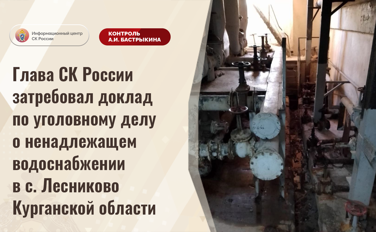 Глава СК России затребовал доклад по уголовному делу о ненадлежащем водоснабжении в с. Лесниково Курганской области В социальной сети сообщается, что в селе Лесниково Курганской области в жилые дома и образовательные учреждения поступает жизненно важный коммунальный ресурс, непригодный для потребления и бытовых нужд. Канализационная насосная станция находится в аварийном состоянии, резервуары для воды покрылись ржавчиной, однако мер реагирования не принимается, ремонтные работы не проводятся. Местные жители опасаются за свое здоровье. В СУ СК России по Курганской области по данному факту возбуждено уголовное дело. Председатель Следственного комитета Российской Федерации Александр Иванович Бастрыкин затребовал у и.о. руководителя СУ СК России по Курганской области Александра Викторовича Миненкова доклад об установленных в ходе первоначальных следственных действий обстоятельствах, а по завершении расследования – о его результатах. Исполнение поручения поставлено на контроль в центрально