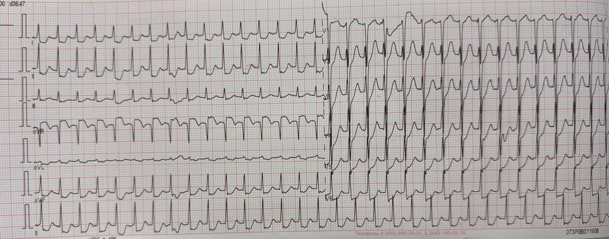 Вот такую ЭКГ удалось записать, когда совершенно случайно на визите к кардиологу возник пароксизм тахикардии: