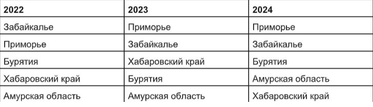 В 2024 году первое место осталось у Приморья, однако популярность хоть и росла, но только в 1,5 раза. На втором месте Забайкалье, где китайские автомобили за год выбирали в два раза чаще. Третья строчка у Бурятии, где популярность выросла также в два раза. На четвертом месте Амурская область — водители выбирали машины брендов Поднебесной почти в 2,5 раза чаще, чем год назад. Пятую строчку занимает Хабаровский край с ростом популярности почти в два раза.