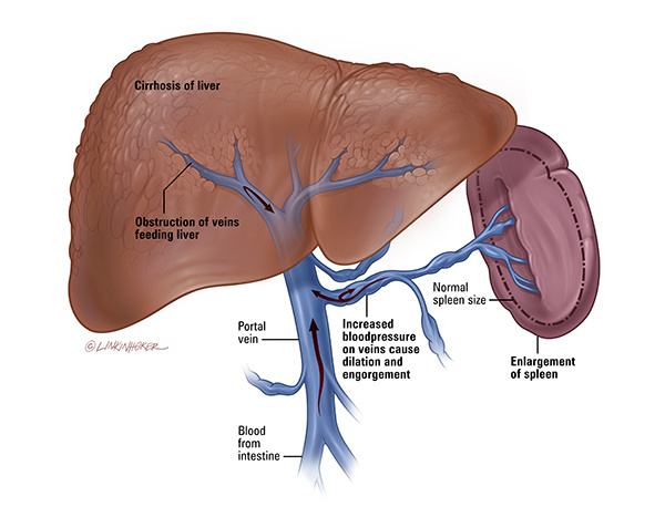 В норме печень принимает кровь от всех органов брюшной полости: желудка, кишечника, поджелудочной железы и селезёнки, вены от них собираются в главную, впадающую в печень - воротную вену (она же портальная - по-латински). При циррозе большое количество рубцов мешает печени собирать кровь с обычной скоростью, по сути своей она механически становится "засорившимся фильтром". Из-за этого кровь замедляет свой ход и растягивает вены брюшной полости, увеличивает селезёнку как депо крови. Это осложнение цирроза называется портальной гипертензией. И это первый уровень осложнений цирроза.