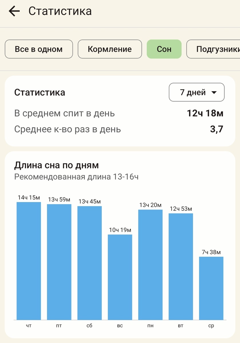 С самого рождения Никитки, я скачала приложение в котором можно отмечать сны, кормления, купания, подгузники (туалет), развитие, сцеживания. Больше всего меня интересовал пункт с режимом сна. Пусть и маленький человек, но хотелось какого-то режима. Но, не сложилось, совсем не сложилось ... У маленьких ведь всё в кучу - регрессы сна, кризисы взросления и умелок, прорезывания зубов, простуды и колики. Я боролась за режим как могла, но не тут-то было. Как это обычно бывает, всё было одновременно. А сейчас новый виток. 8 месяцев и 3 недели. Ложится чуть раньше обычного (раньше было в районе 23, сейчас 22). Но я просто пыталась продлить ночной сон, поскольку Никитка между снами выдерживает всё больше перерыв. А значит, вот он переход с трёх на два сна. И казалось бы, и ночной сон должен продлиться. А по итогу вообще всё сломалось 😂 На скриншоте видно, что с субботы - приезда на дачу, сны стали короче и потому чаще( А просыпания с ночного сна всё раньше (6:30, 7:00). Я надеялась, что это