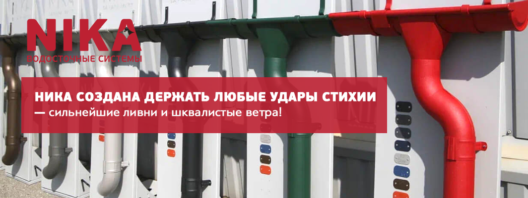 Проект NIKA был разработан в рамках Государственной программы по импортозамещению и нацелен на переработку российской стали, что позволяет предложить потребителю качественную продукцию по доступной цене! Почему NIKA Надежная стальная водосточная система NIKA – это продуманная организация водостока для крыши вашего дома. Сконструирована с учетом всего опыта, накопленного в этой отрасли. Произведена на современном скандинавском оборудовании от европейских лидеров из высококачественный российской стали с двусторонним полимерным покрытием. Оцинкованная сталь в основе обеспечивает жёсткость, водосточная система не коррозирует и великолепно выдерживает внешние воздействия. Водосточная система NIKA используется для эффективного сбора и отведения дождевой воды с кровли дома. Система позволяет собирать воду до 8 см высотой, что является оптимальным для большинства регионов России. NIKA создана держать любые удары стихии – сильнейшие ливни и шквалистые ветра. Это ее главное предназначение, но не