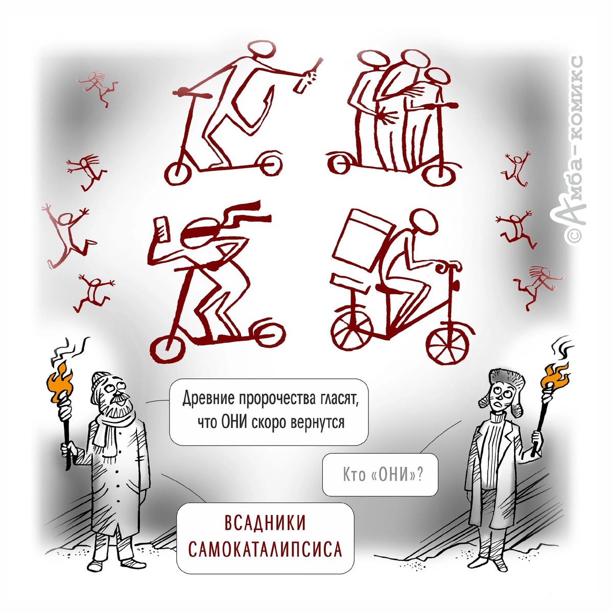 Художница NatalyNoskova тоже решила с помощью комикса выразить свое мнение о тех, кто уже не может себе представить передвижение по городу без самоката.