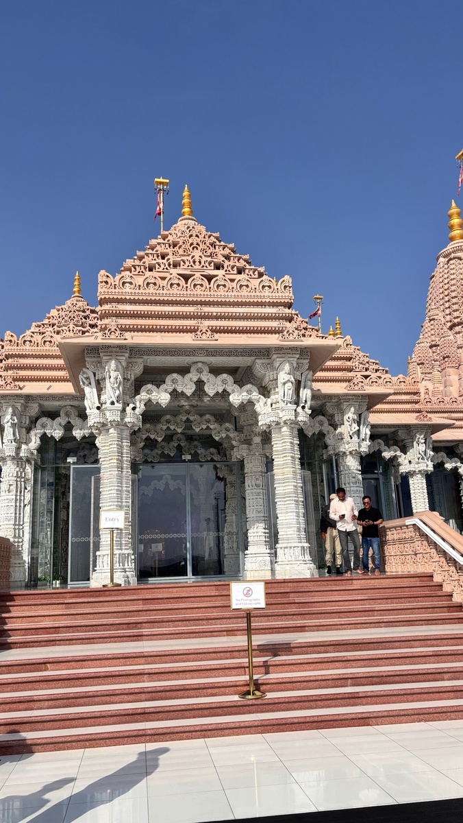 Вчера посетили самый первый индуиский храм Хинду Мандир в Абу Даби. Открыт он был совсем недавно, в прошлом 2024 году. Монументальное сооружение! Резной храм из розового песчаника и белого мрамора. Состоит из 7 шпилей и куполов! Цифра 7 обозначает единение 7 эмиратов. Информации в интернете тоже не так много, но кое-что я нашла. Не так много, просто общие сведения. Народу было очень много, может потому что открывается он только вечером с 17 до 20.00 . Не знаю с чем это связано, может с Рамаданом, а может и с тем, что храм действующий и чувства верующих уважают. И обувь обязательно снимается перед входом в храм. Снимать внутри тоже нельзя. Но и насладиться такой красотой невозможно! Внутри всё из белого мрамора, резное. Очень много мелкой резьбы, сценки из жизни людей и животных . Внутри статуи божеств, которым поклоняются индусы. Это фот потолка взяла у сына, он был раньше и тоже снимал! А поскольку внутри снимать нельзя попробовали сделать фото хотя бы так.