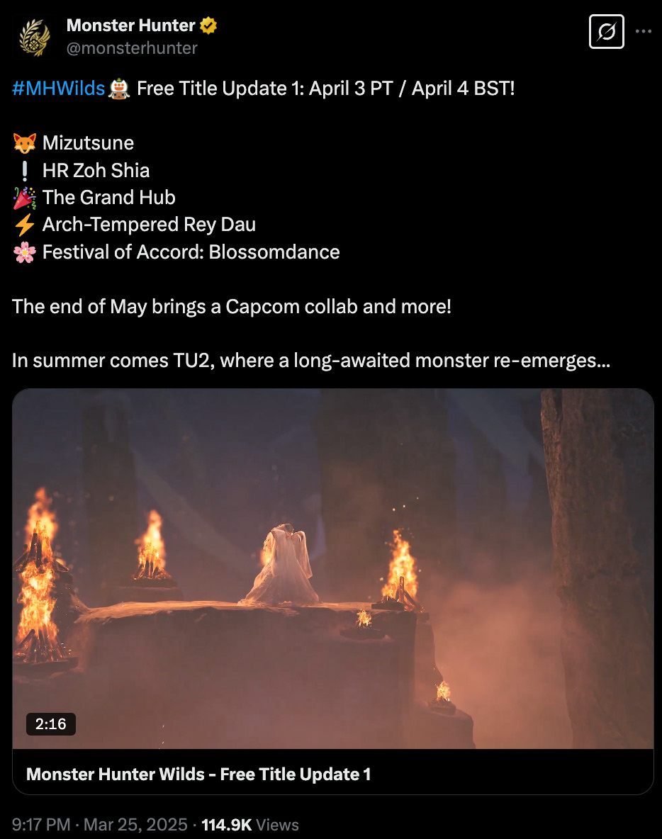 Помимо обзора первого обновления, на презентации Monster Hunter Wilds также приоткрыли завесу над будущими дополнениями. Начиная с 22 апреля игроков ждет сезонное событие "Фестиваль Согласия: Танец цветения" (Festival of Accord: Blossomdance), которое продлится до 6 мая. А с 29 апреля по 20 мая, появится возможность сразиться с Арх-Закаленным Рэй Дау.