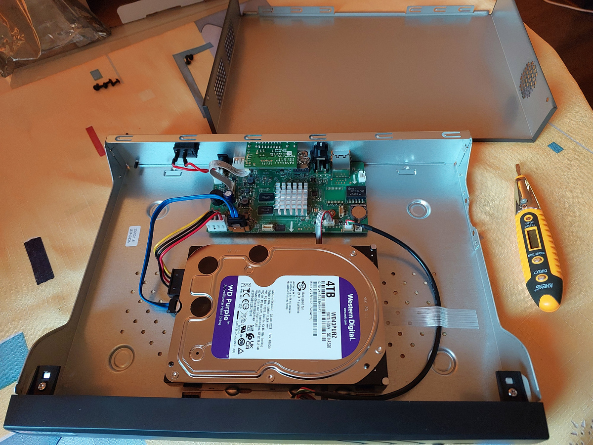 Заказчику дополнительно потребовался небольшой сегмент ЛВС для системы видеонаблюдения. Партия сказала надо, комсомол ответил Есть! :-) Нами было предложено оборудование HiWatch, камеры видеонаблюдения на 4Mp с возможностью записи звука. Видеорегистратор также от производителя HiWatch, с возможностью подключения до 16 камер, с передовых протоколом сжатия видеопотока H265+, с диском HDD ёмкостью 4Tb. Кожух видеорегистратора был снят, смонтирован и подключён жёсткий диск, проверена работа устройства. Рутина... )))