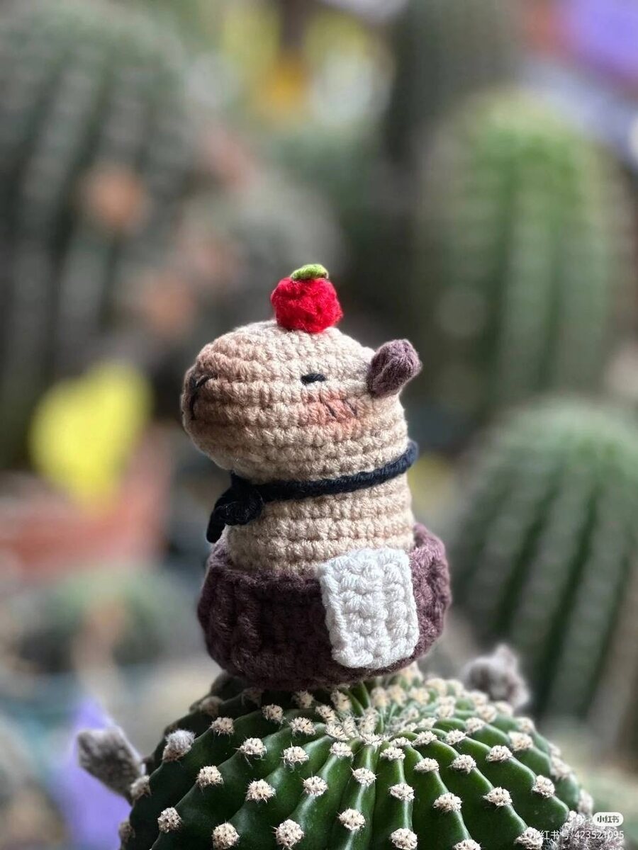 Материалы Голова и тело 1р. 5вп, со 2-ой от крючка: 3сбн, 3сбн в одну, 2сбн, пр 2р. пр, 2сбн, 3пр, 2сбн, 2пр 3р. пр, 3сбн, (пр, сбн)*3, 2сбн, (пр, сбн)*2 4р. пр, 4сбн, (пр, 2сбн)*3, 2сбн, (пр, 2сбн)*2 5-7р. 28сбн 8р. сбн, пр, 7сбн, уб, (сбн, уб)*2, 8сбн, пр, сбн, пр 9р. 9сбн, 3уб, 13сбн 10р. 9сбн, уб из 3х петель, 13сбн 11р. 8сбн, 3пр, 12сбн 12-16р. 26сбн 17р. За зс (уб, 2сбн)*6, 2сбн 18р. (уб, сбн)*6, 2сбн 19р. 7уб Закрыть отверстие Уши 1р. 6сбн в КА Ванна 1р. 6сбн в КА 2р. 6пр 3р. (сбн, пр)*6 4р. (2сбн, пр)*6 5р. (3сбн, пр)*6 6р. За зс 30сбн 7-8р. (3ссн обычные, 3ссн выпуклые)*до конца Полотенце Поворотными рядами 1р. 11вп 2р. 10сбн Яблоко 1р. 6сбн в КА 2-3р. 6сбн 4р. 3уб Закрыть отверстие Лист 2вп Шарф вп, делаем нужной длинны Сборка Пришиь ушки на голову; вышить мордочку; на мокушку пришить яблоко, завязать шарф, посадить капибару в ванну, к ванне пришить полотенце.