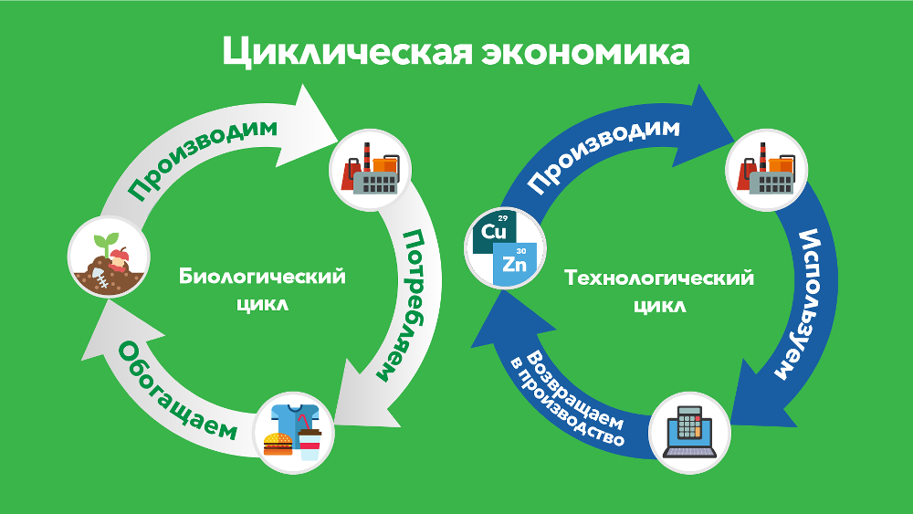 Добыли → Произвели → Выбросили (90% ресурсов теряются) 🔄 Замкнутый цикл: