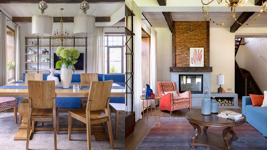Владельцы дома — семейная пара. Супруги работают руководителями подразделений в крупной компании. Они хотели видеть в интерьере загородного дома стиль шале, но необычный, авторский. Основная идея была в том, чтобы, сохранив настроение шале, создать особенный, яркий, запоминающийся интерьер. Использовать небесно-синий цвет предложила хозяйка и это решение оказалось одним из ключей концепции, важным объединяющим моментом эклектичного, по сути, интерьера.