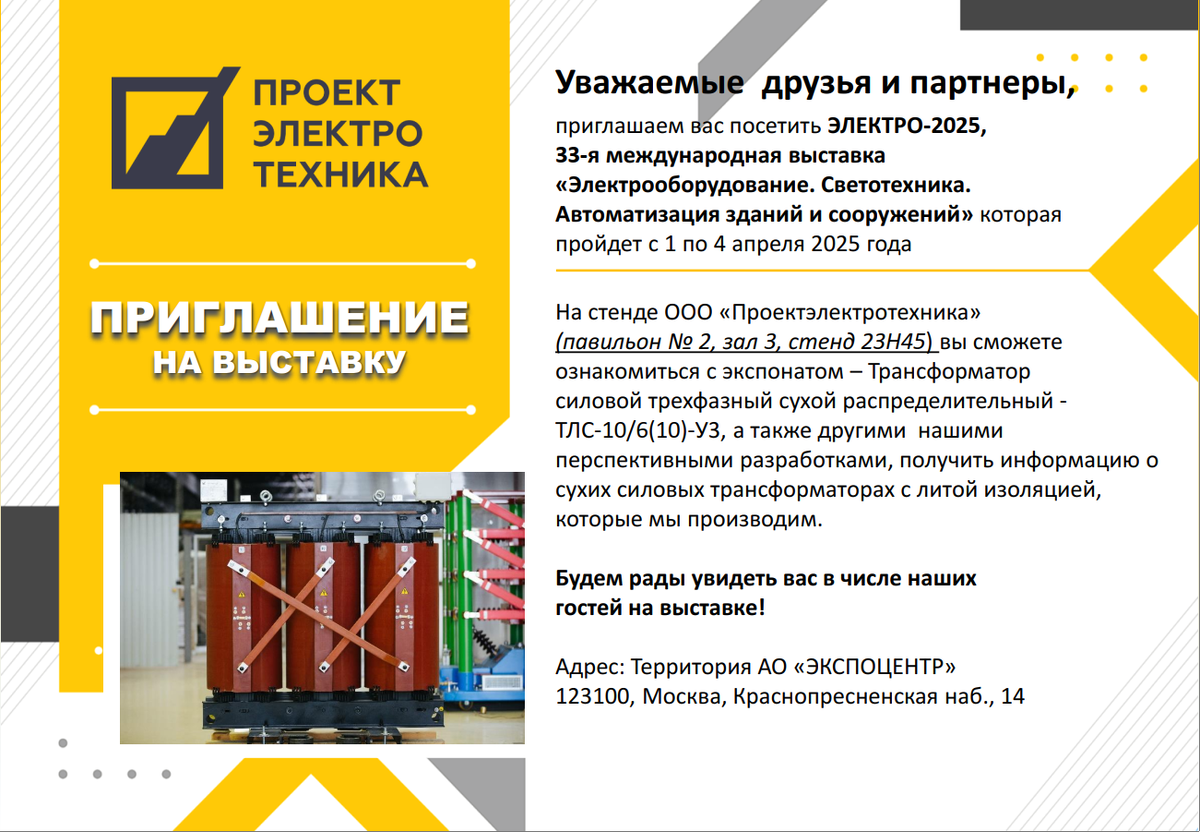 Уважаемые коллеги и партнеры! Приглашаем вас посетить наш стенд на 33-й международной выставке «Электрооборудование. Светотехника. Автоматизация зданий и сооружений» (Электро-2025), которая пройдет с 1 по 4 апреля на территории АО «ЭКСПОЦЕНТР» по адресу: Москва, Краснопресненская наб., 14. Вы найдете нас в павильоне 2, зал 3, стенд № 23H45. На стенде ООО «Проектэлектротехника» вы сможете ознакомиться с нашим экспонатом – Трансформатором силовым трехфазным сухим распределительным ТЛС-10/6(10)-У3, а также узнать о других перспективных разработках нашей компании. Наши специалисты предоставят вам подробную информацию о сухих силовых трансформаторах с литой изоляцией, которые мы производим. Будем рады видеть вас на нашем стенде