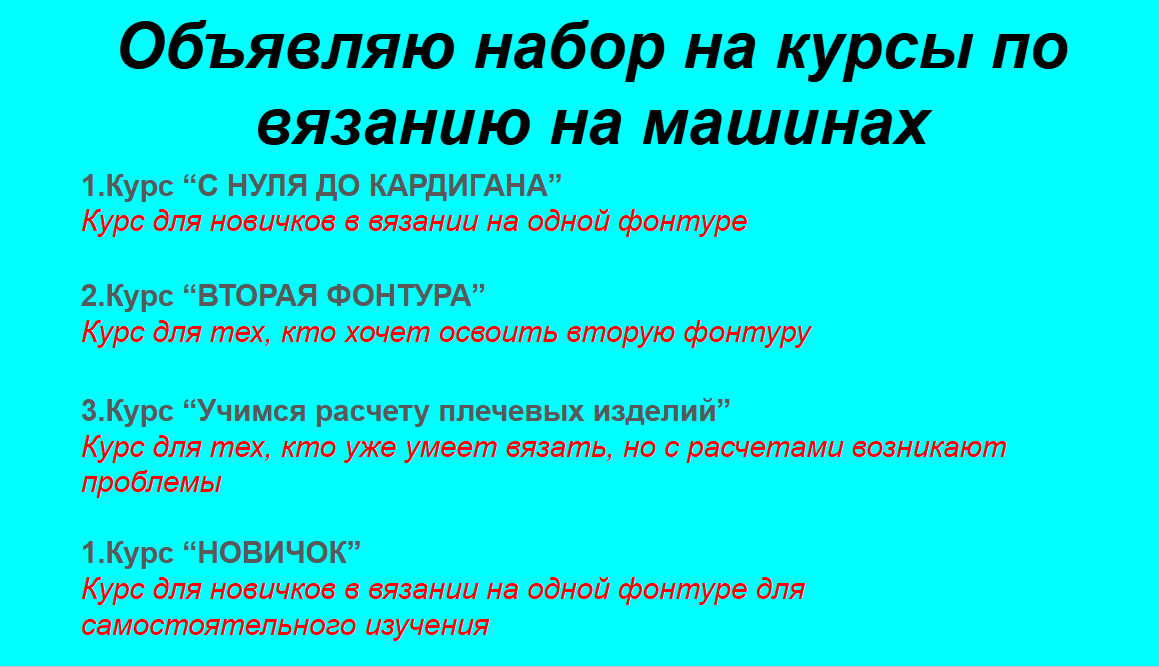 ❤️Всем привет! 😘Начинаю очередной набор на курсы по машинному вязанию Курс НОВИЧОК цена курса 8 000 рублей Подробнее о курсе ЗДЕСЬ (https://vk.com/market/product/kurs-mashinnogo-vyazania-quotnovichokquot-bez-soprovozhdenia-81506385-12936855) ‼️‼️‼️Но для вас у меня есть интересное предложение‼️‼️‼️ ✅Для тех, кто оплатит курс до 28 марта скидка 30% всего за 5600 рублей ✅Для тех, кто оплатит курс до 02 апреля скидка 20% всего за 6400 рублей ✅Для тех, кто оплатит курс до 07 апреля скидка 10% всего за 7200 рублей Курс С НУЛЯ ДО КАРДИГАНА цена курса 12 000 рублей Подробнее о курсе ЗДЕСЬ (https://vk.com/market/product/kurs-mashinnogo-vyazania-quots-nulya-do-kardiganaquot-81506385-12936871) ‼️‼️‼️Но для вас у меня есть интересное предложение‼️‼️‼️ ✅Для тех, кто оплатит курс до 28 марта скидка 30% всего за 8400 рублей ✅Для тех, кто оплатит курс до 02 апреля скидка 20% всего за 9600 рублей ✅Для тех, кто оплатит курс до 07 апреля скидка 10% всего за 10800 рублей Курс ВТОРАЯ ФОНТУРА цена к