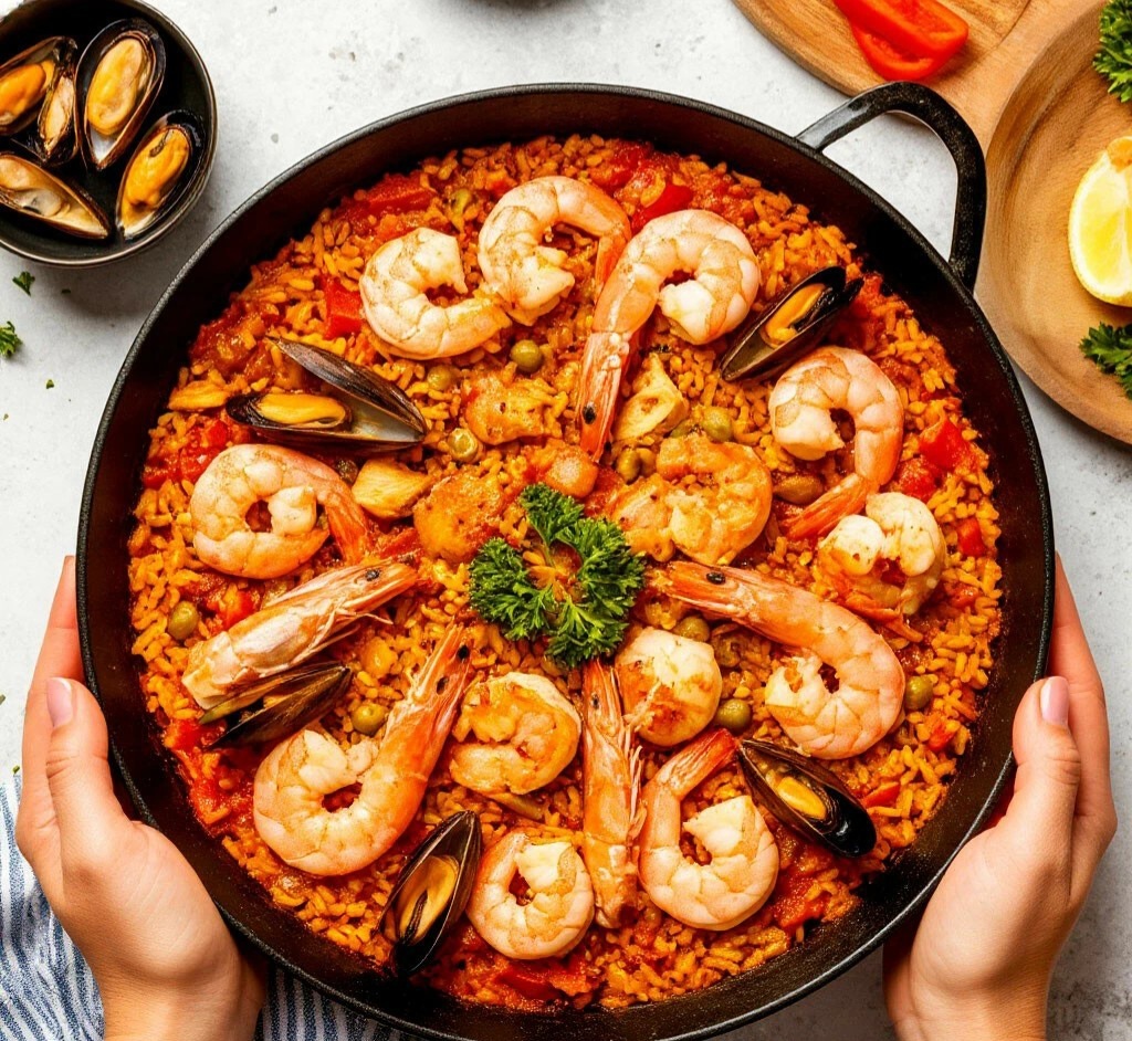 Это визитная карточка испанской кухни, особенно региона Валенсия. Это ароматное, насыщенное блюдо с шафраном, морепродуктами, курицей и овощами. Ингредиенты (на 4 порции): Основные: 300 г риса для паэльи (Bomba или Calasparra) 200 г куриного филе (или бедра) 200 г мидий в раковинах 200 г креветок 100 г кальмаров (кольцами) 1 сладкий перец 1 помидор 1 луковица 2 зубчика чеснока 1 л куриного бульона 1 ч. л. шафрана (можно заменить куркумой) 1 ч. л. паприки Оливковое масло Соль, перец по вкусу Дополнительно (по желанию): 100 г зеленой фасоли Лимон для подачи Петрушка или кинза Приготовление: Подготовка ингредиентов Курицу нарезать небольшими кусочками. Овощи: лук и чеснок мелко нарезать, перец соломкой, помидор очистить от кожицы и натереть на терке. Морепродукты промыть, креветки очистить (можно оставить хвостики). Обжарка мяса и овощей В паэльере (или глубокой сковороде) разогреть оливковое масло. Обжарить курицу до золотистой корочки, посолить и поперчить. Добавит