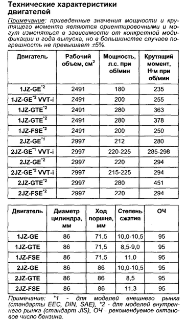 MARK II / CHASER / CRESTA / CROWN / PROGRES / BREVIS / ARISTO / LEXUS GS300 / SOARER / SUPRA / ALTEZZA GITA / LEXUS IS300 Любой агрегат автомобиля нужно обслуживать с периодичностью определенного пробега, в данной модели двигателей эти данные представлены в таблице ниже Объемы заправочных емкостей : Моторное масло в двигателе : Замену моторного масла в двигателе необходимо производить каждые 10000км. 1JZ-GE (JZX80) 1JZ-GE (Модели 2WD) 1JZ-GE (Модели 4WD) 1JZ-FSE (Модели 2WD) 1JZ-FSE (Модели 4WD) 2JZ-GE 2JZ-FSE 2JZ-GTE Охлаждающая жидкость : Замену охлаждающей жидкости в автомобиле следует производить в интервале 40000км., т.к. при эксплуатации она теряет свои свойства и может навредить многим узам автомобилей, например, шлангам, радиаторам, гбц и даже блоку цилиндров. Пока на этом всё, ждите следующих статей.