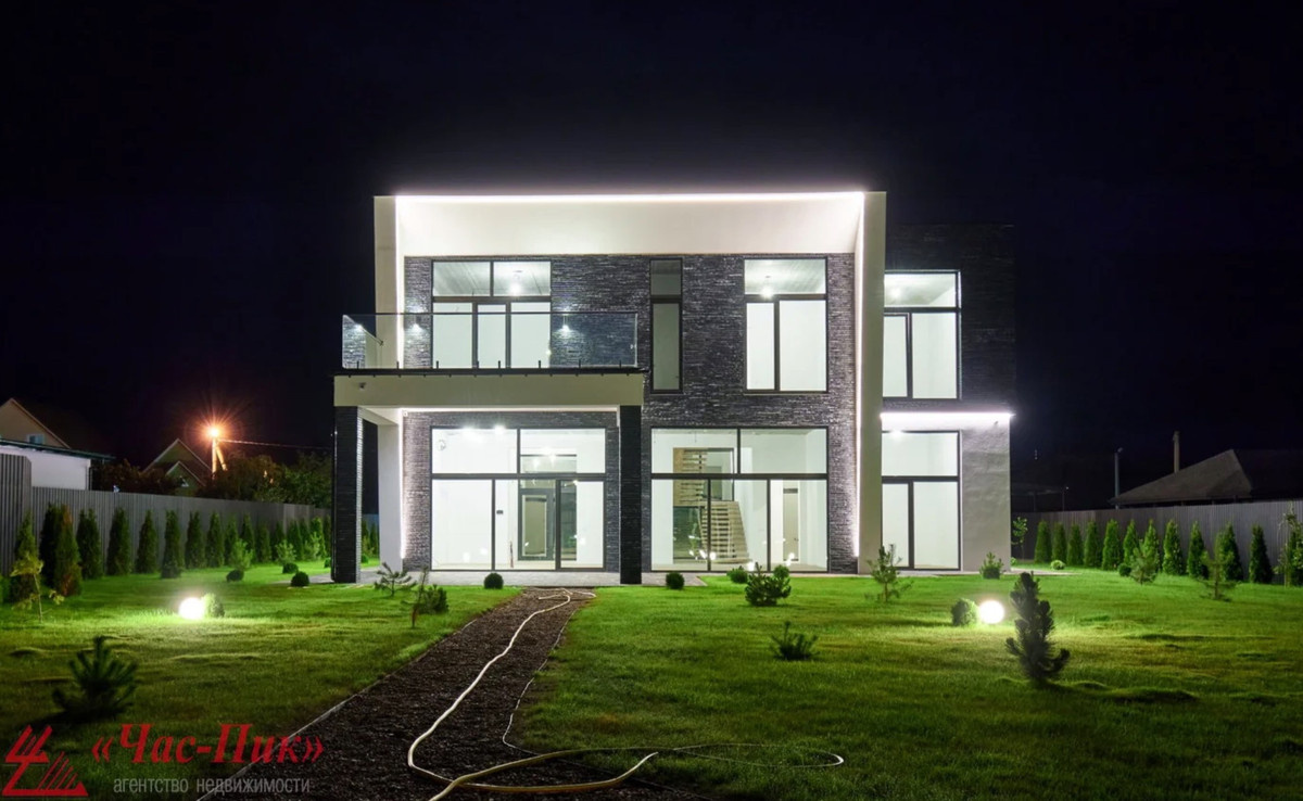 В Колодищах выставили на продажу загородный дом с футуристичной архитектурой. Стильный коттедж расположен на первой береговой линии Лесного озера и имеет выход к Глебковскому биосферному заказнику. Дом построен по индивидуальному проекту с применением энергоэффективных решений. Стены выполнены из керамзитобетонных блоков с утеплением, фасад отделан декоративной штукатуркой и клинкером. Кровля эксплуатируемая, утеплена и оборудована скрытой ливневой системой. Снаружи коттедж выглядит довольно эффектно, особенно с подсветкой. Большую часть фасада занимают панорамные окна — в зоне лестницы они размером с два этажа! Площадь объекта — 300 «квадратов». По проекту в нем будет шесть жилых комнат. Высота потолков — 3,91 м. Внутри — черновая отделка. В коттедже предусмотрена современная инженерная система: газовый котел Viessmann, радиаторы и теплые полы, система «умный дом», видеонаблюдение и удаленный доступ к видеодомофону. Ворота на участке оснащены электроприводом. Все коммуникации — кана