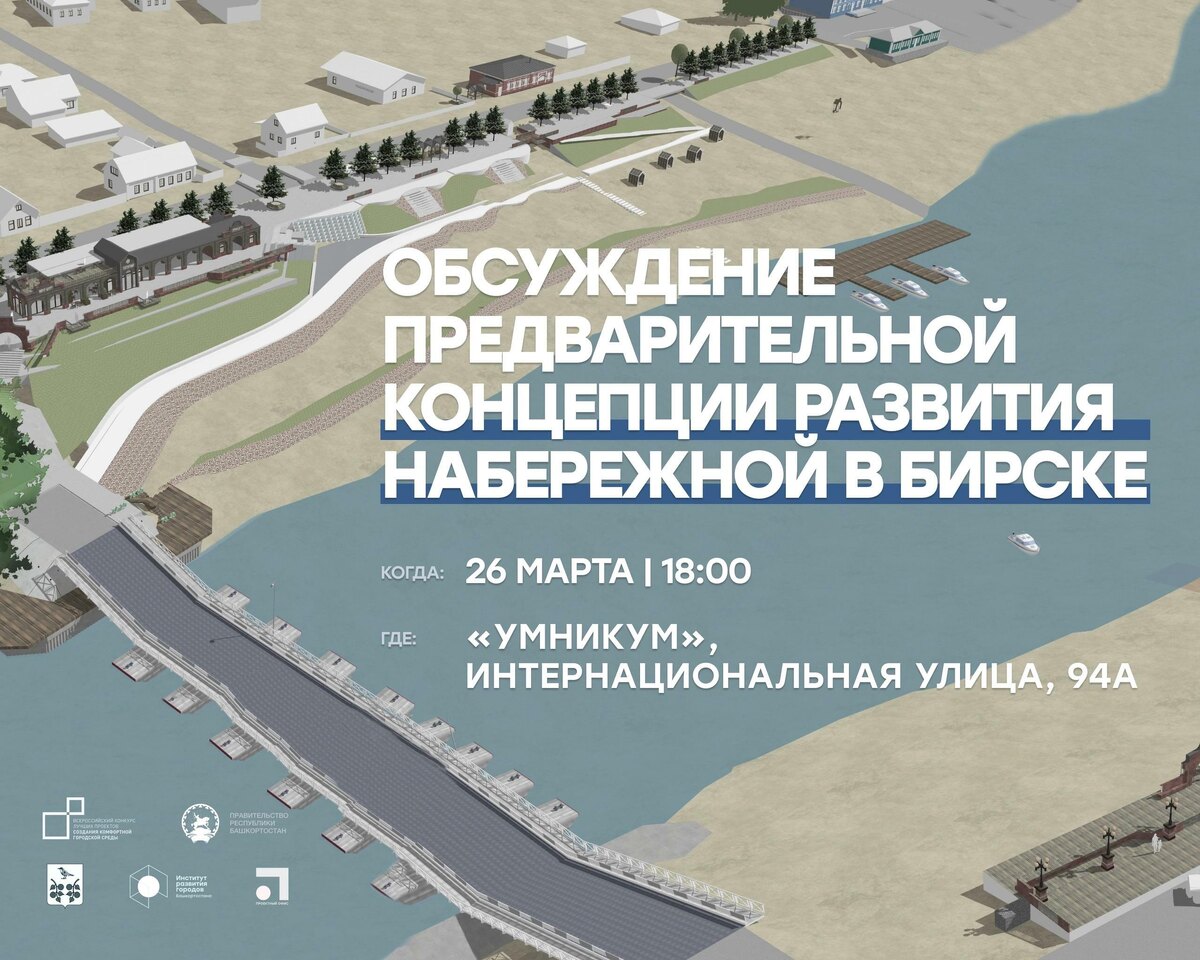 26 марта с 18.00 до 20.00 в ТОК-центре «Умникум» (ул.Интернациональная, 94-а) состоится открытый общегородской семинар, где архитекторы представят предварительный проект благоустройства набережной, разработанный на основе предложений бирян, поступивших на первой встрече.