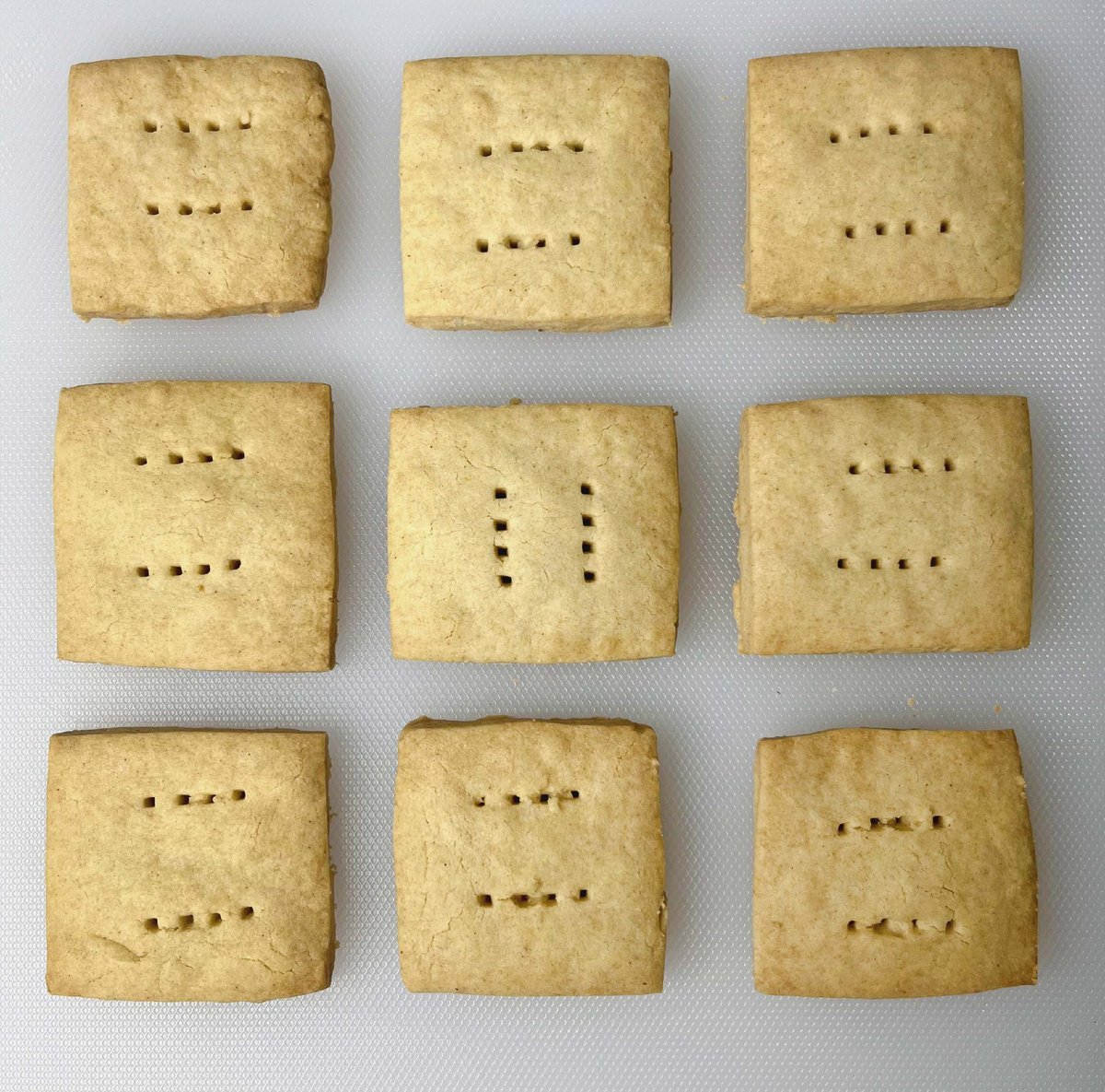 Через 30 минут выньте тесто из холодильника и нарежьте на 16 кусочков с помощью ножа или скребка для теста. Сделайте отверстия с помощью вилки для украшения (не торопитесь, тесто достаточно ломкое).