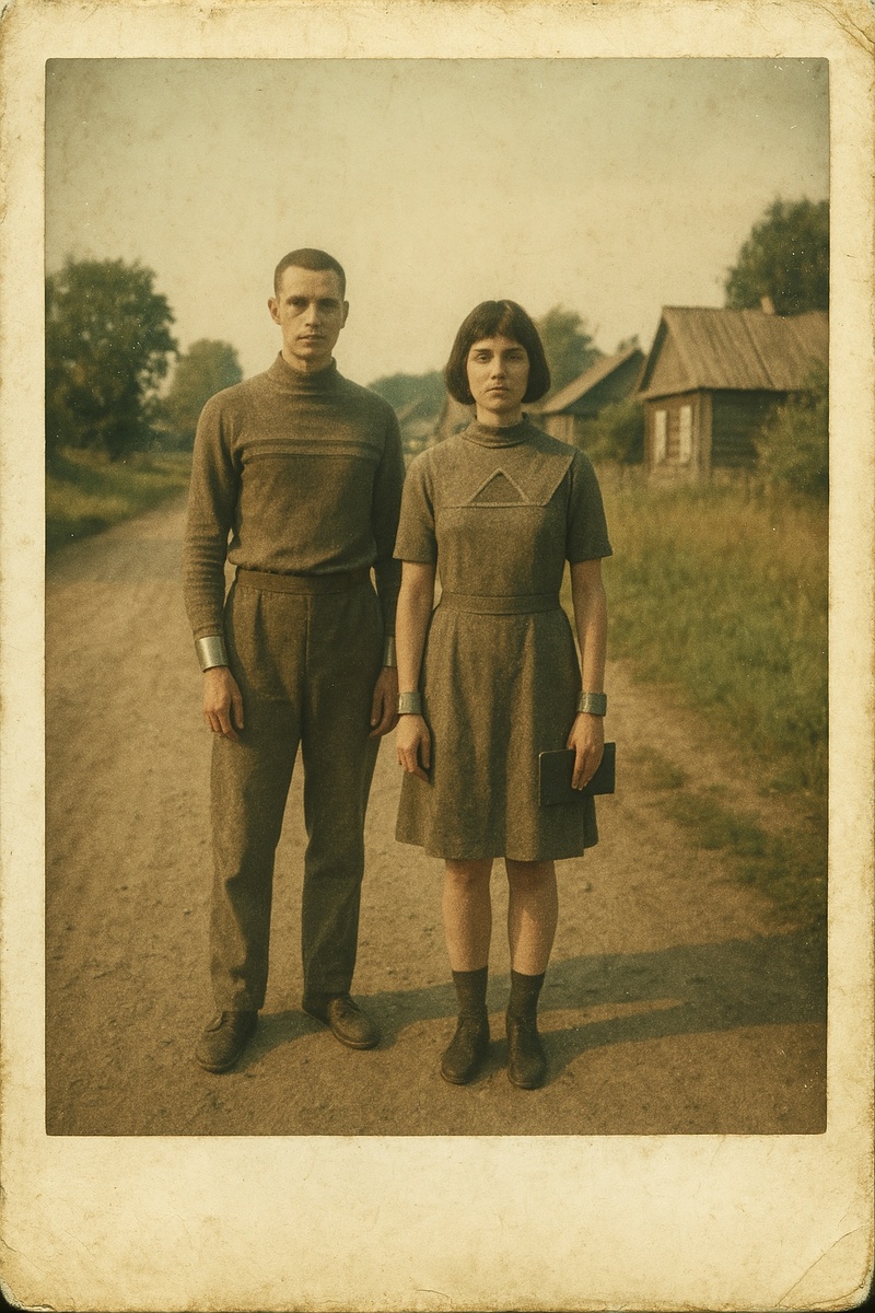 Их внешний вид многим показался странным, хотя ничего откровенно инопланетного или фантастического в них не было. Мужчина и женщина. Светловолосые, высокие, чересчур чистые для тех мест, особенно в сезон распутицы. Одеты они были в пальто вроде бы привычного покроя, но с какими-то металлическими вставками на манжетах и воротнике. На запястьях — браслеты, напоминающие часы, только вместо циферблата — чёрный зеркальный овал, без стрелок и цифр. Когда один из местных — слесарь Пётр Громов — спросил у них дорогу ли ищут, женщина ответила, что вернутся «через два стандартных цикла». Что это значило, никто не понял.